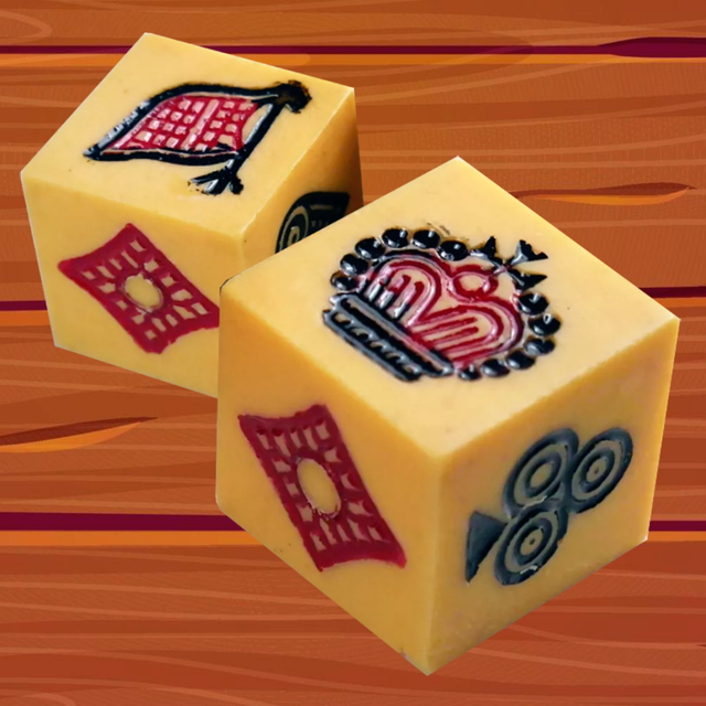 The dice used in Jhandi Munda are unique, each side representing one of the six symbols: Heart, Spade, Diamond, Club, Face, and Flag.