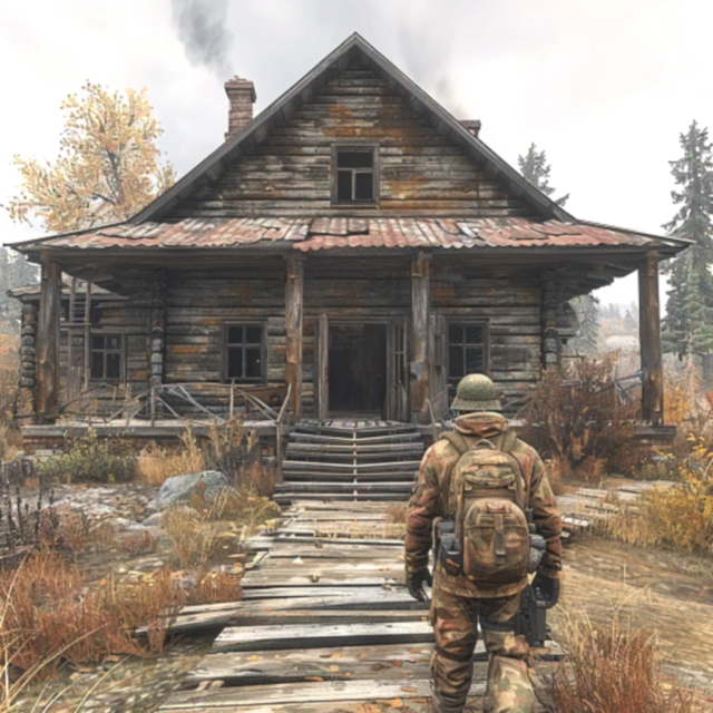Zwei Überlebende mit Rucksäcken betrachten eine große Blockhütte in einer Waldkulisse